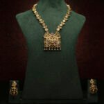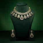 The centerpiece pendant enhances the neckline with its bold geometric silhouette, while the earrings echo the same emerald-polki artistry for a coordinated finish. This versatile piece is perfect for brides, celebrities, and women who want to radiate timeless luxury.
