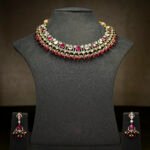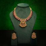 The Lekshmi Coin Neckpiece with Ruby Stones is a regal temple jewellery design that embodies tradition, prosperity, and divine blessings. Featuring rows of gold-plated coins symbolizing wealth and heritage, this masterpiece is highlighted with a central Lakshmi pendant – the goddess of abundance and grace.